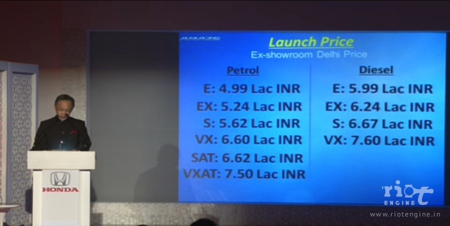 Honda Amaze launched at a starting price of Rs. 4.99 Lakhs for the petrol and Rs. 5.99 lakhs for the diesel